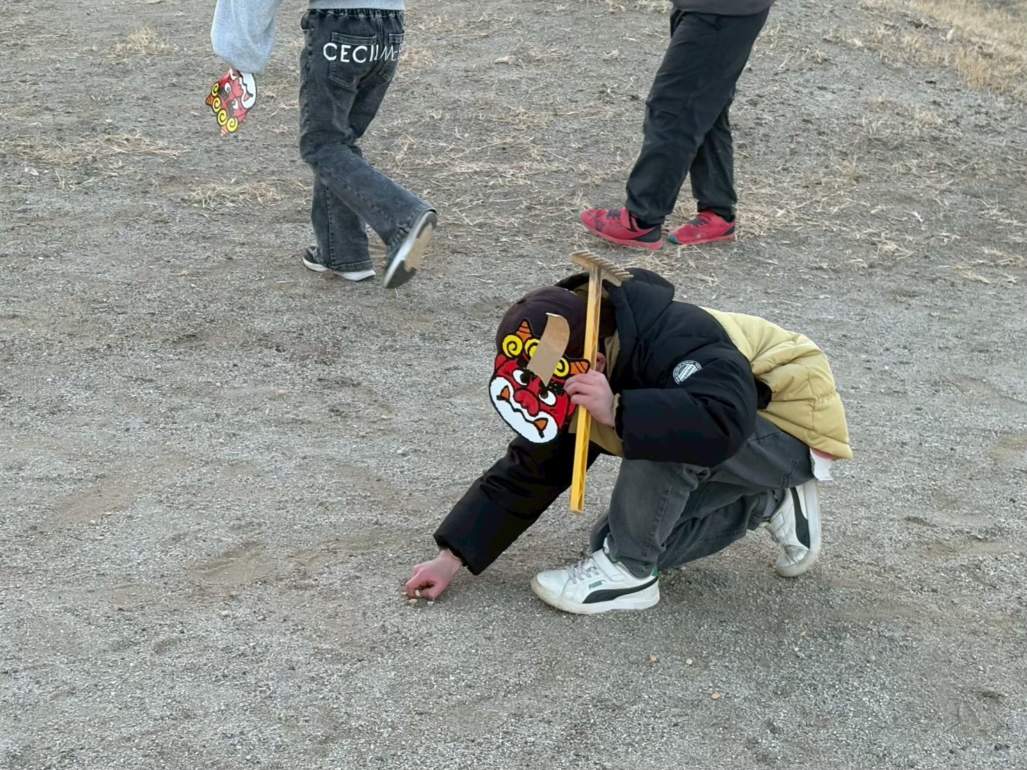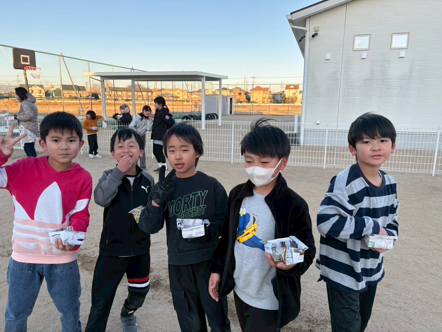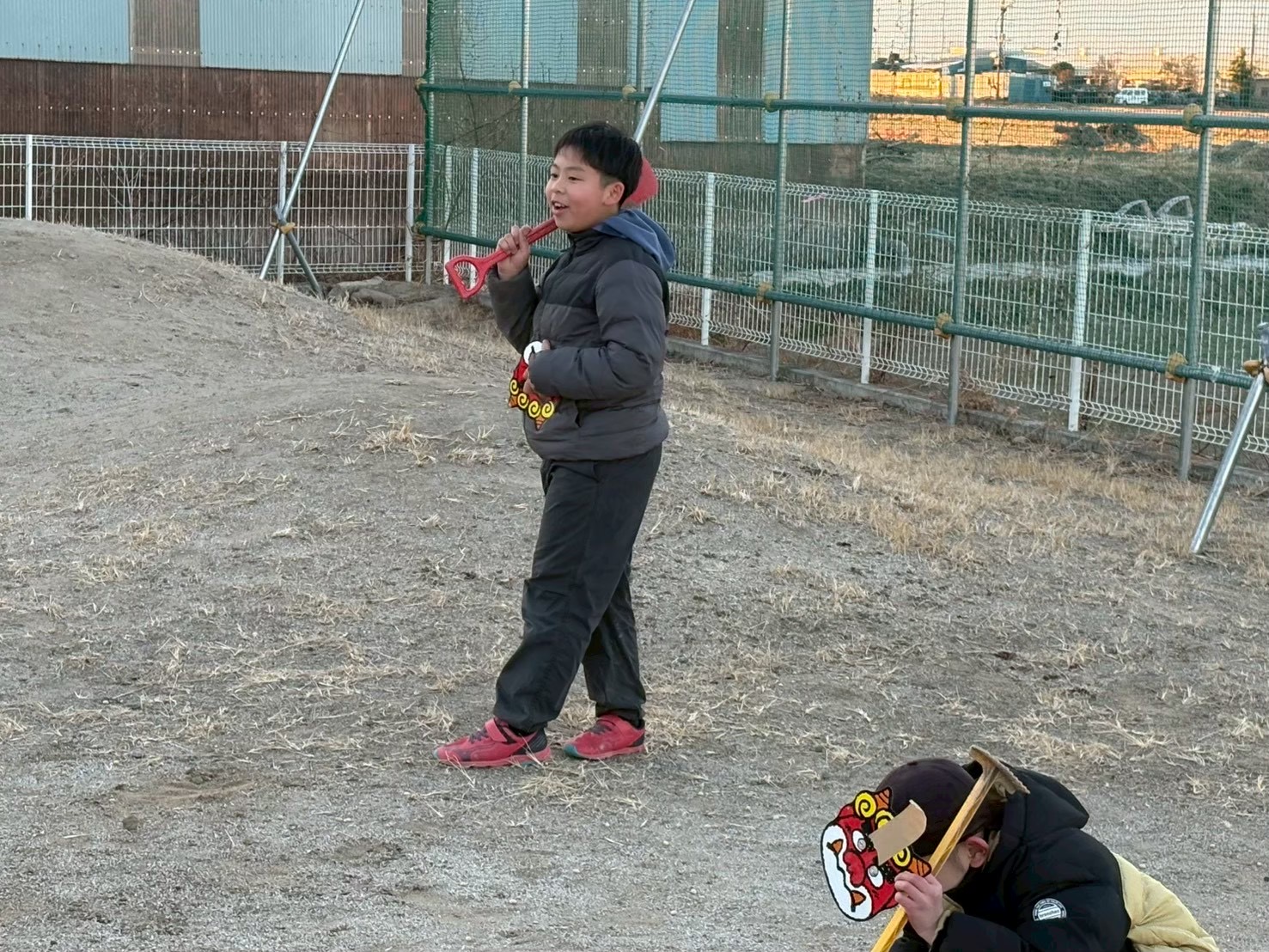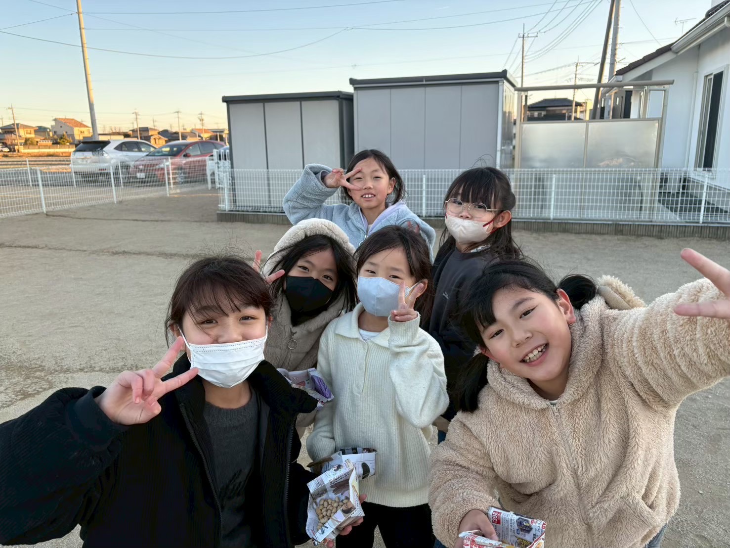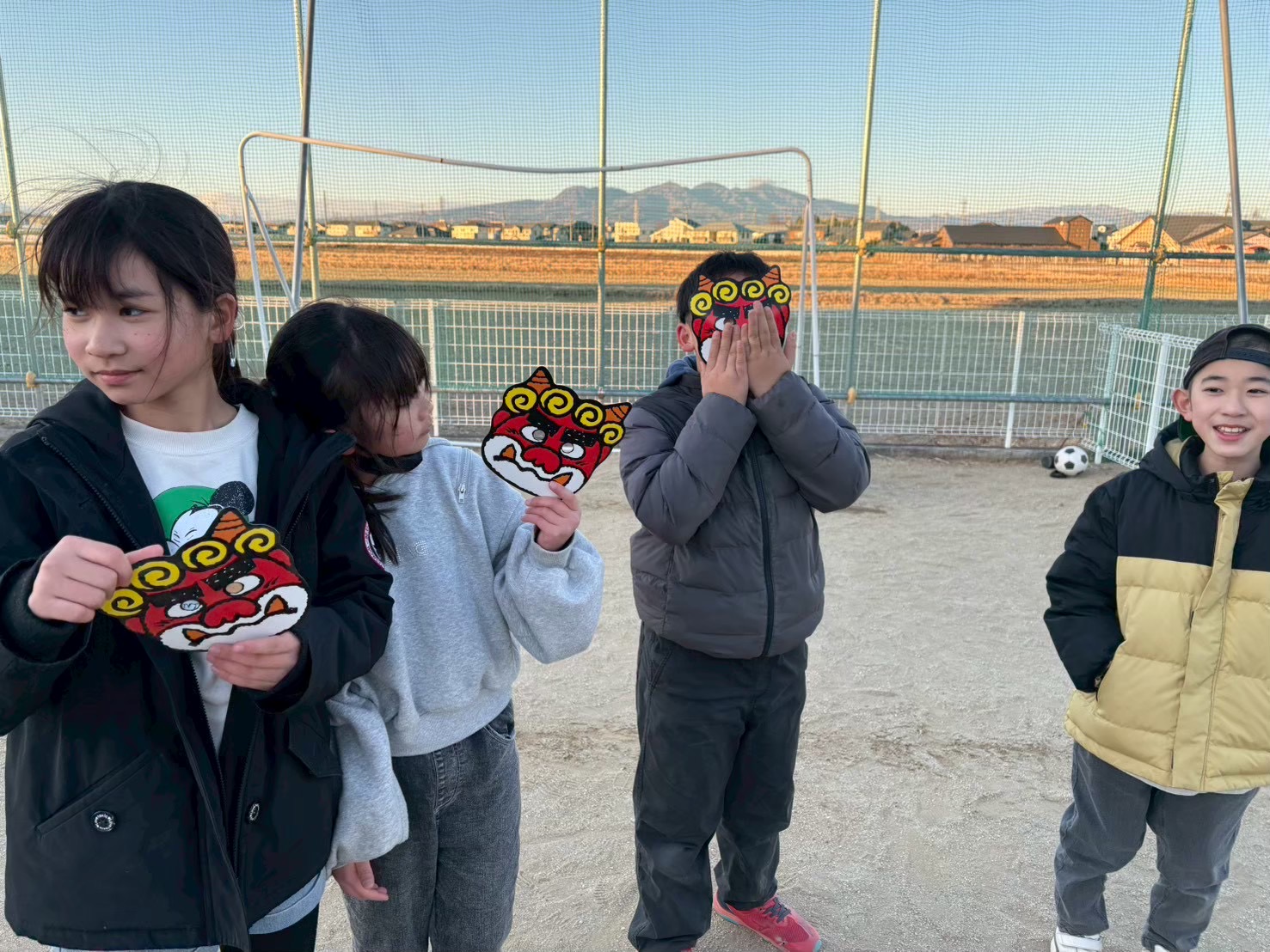 節分の日に学童の庭で豆まきをしました。