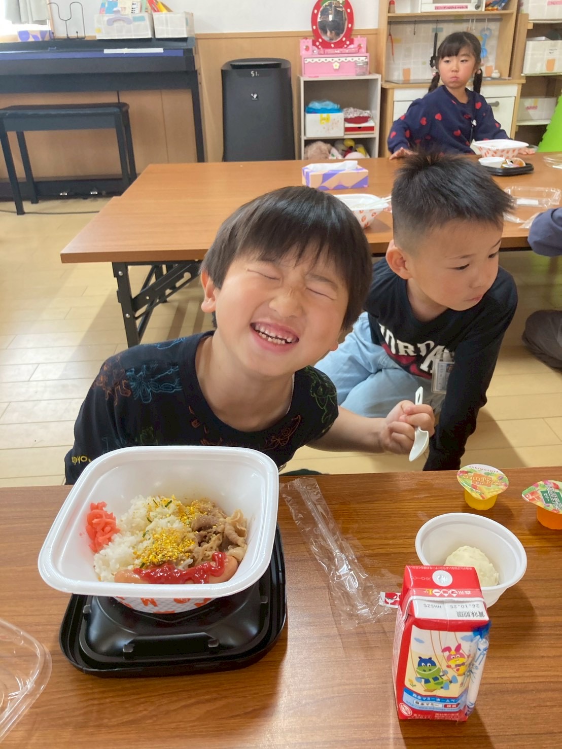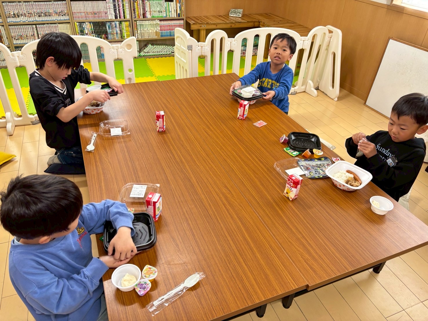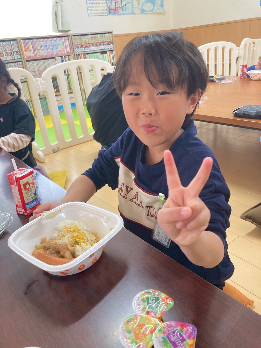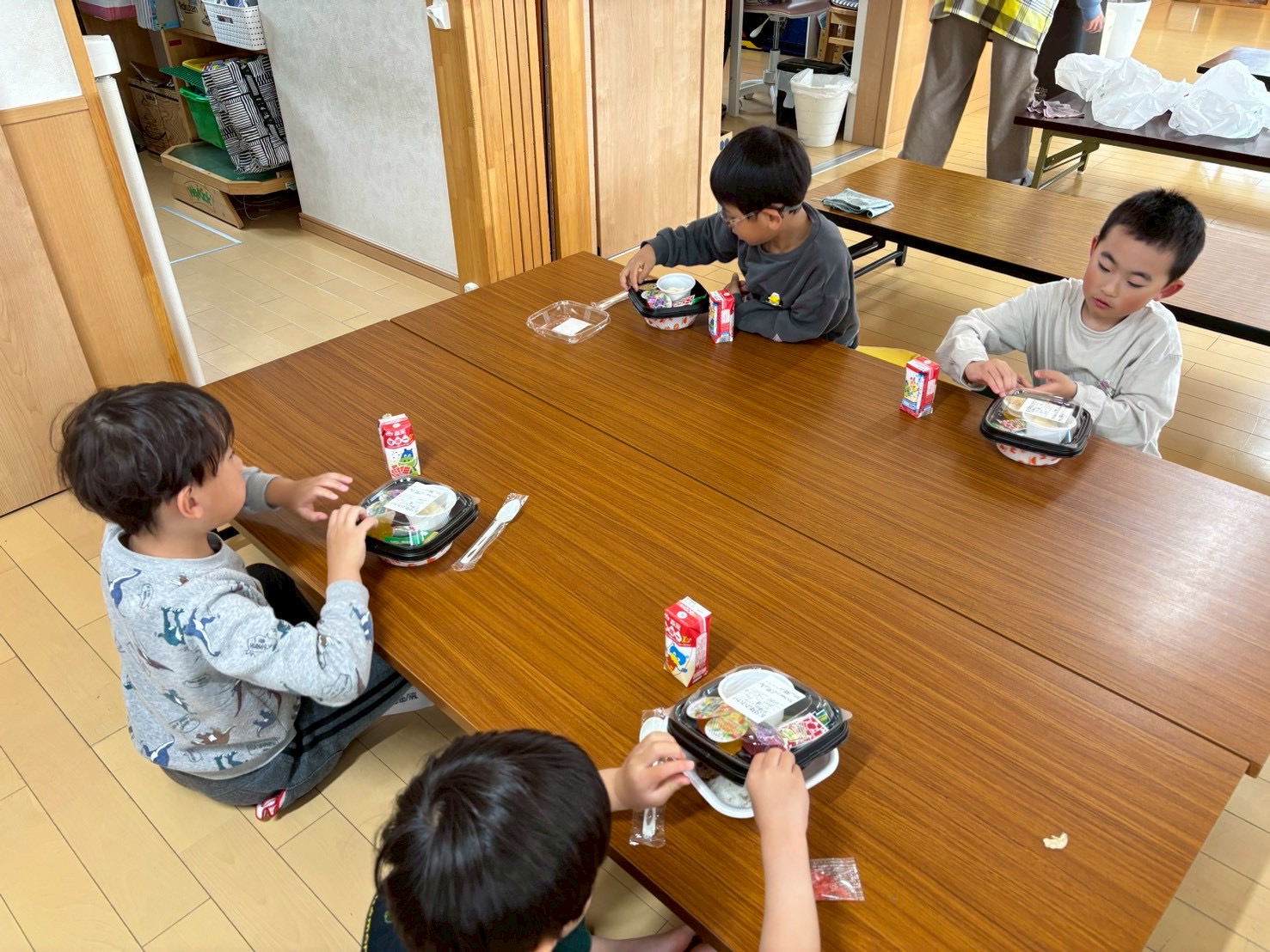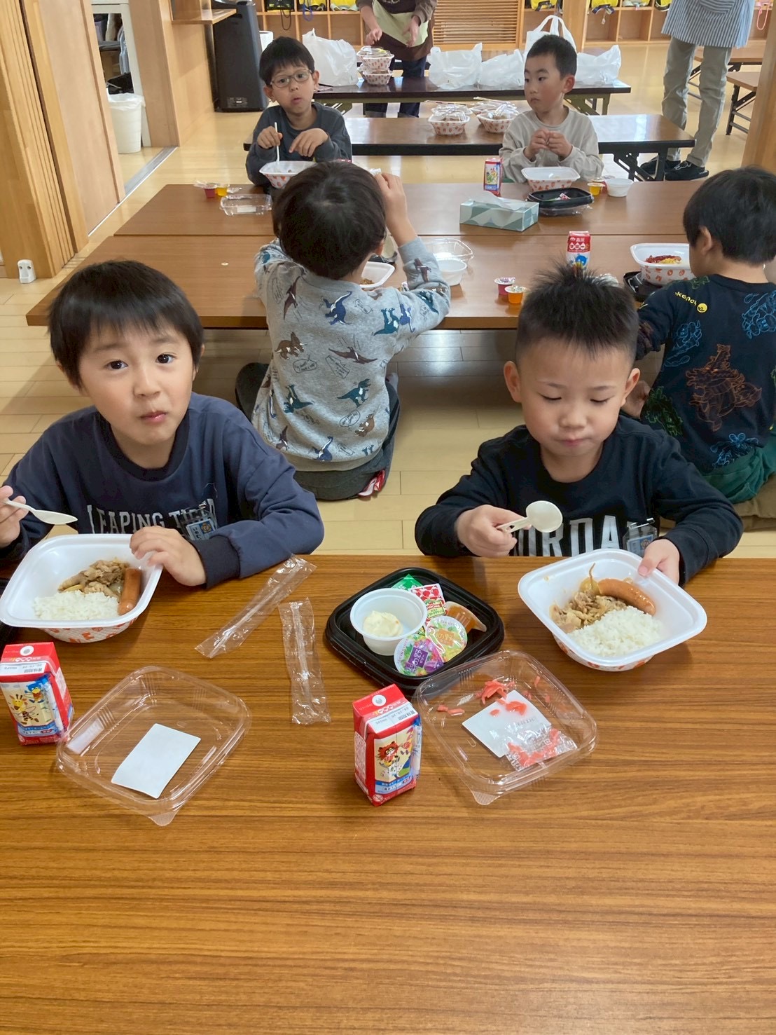 今週は給食なしでの下校のため、一年生には学童でお昼ご飯を提供させて頂いています。