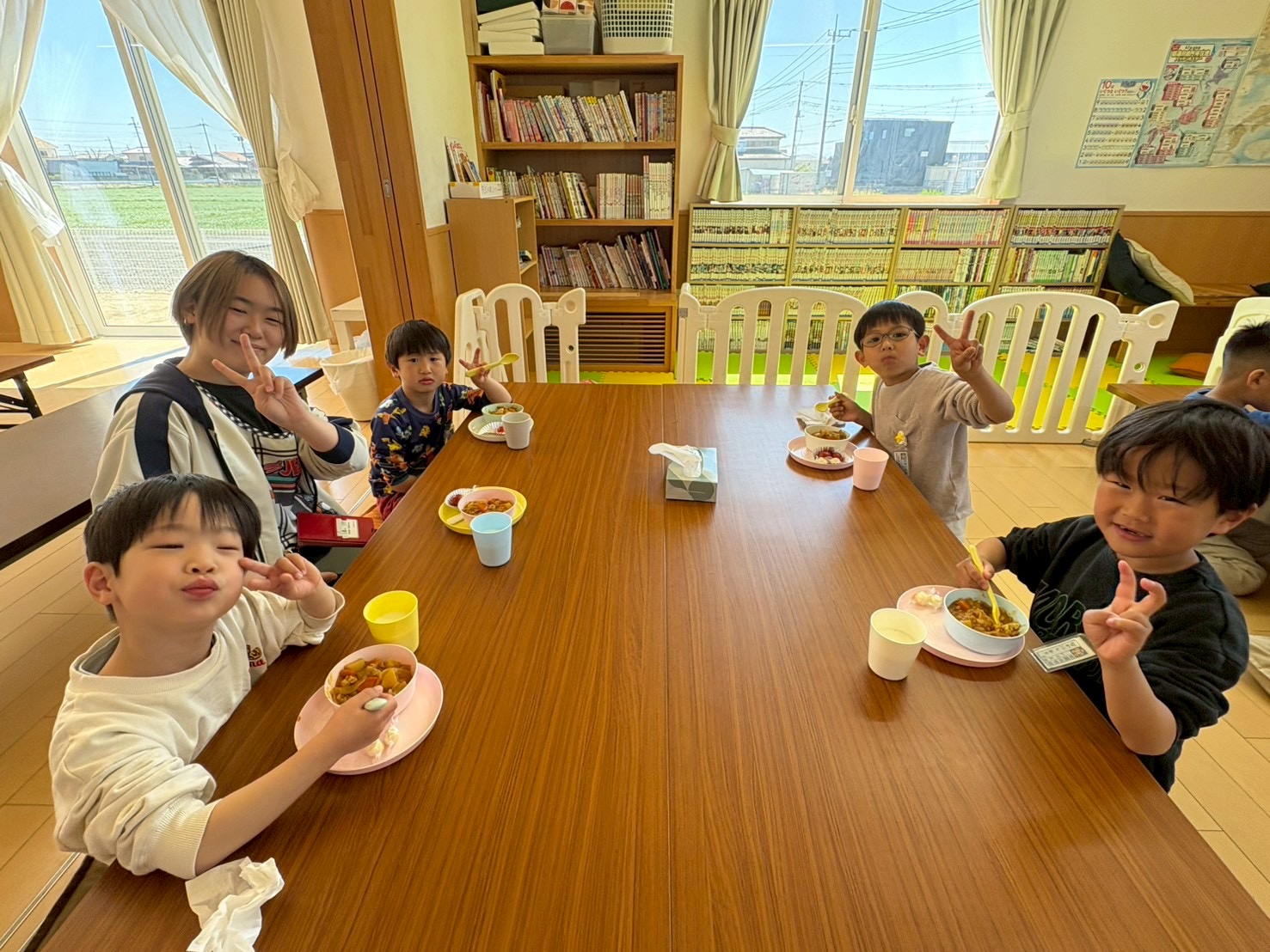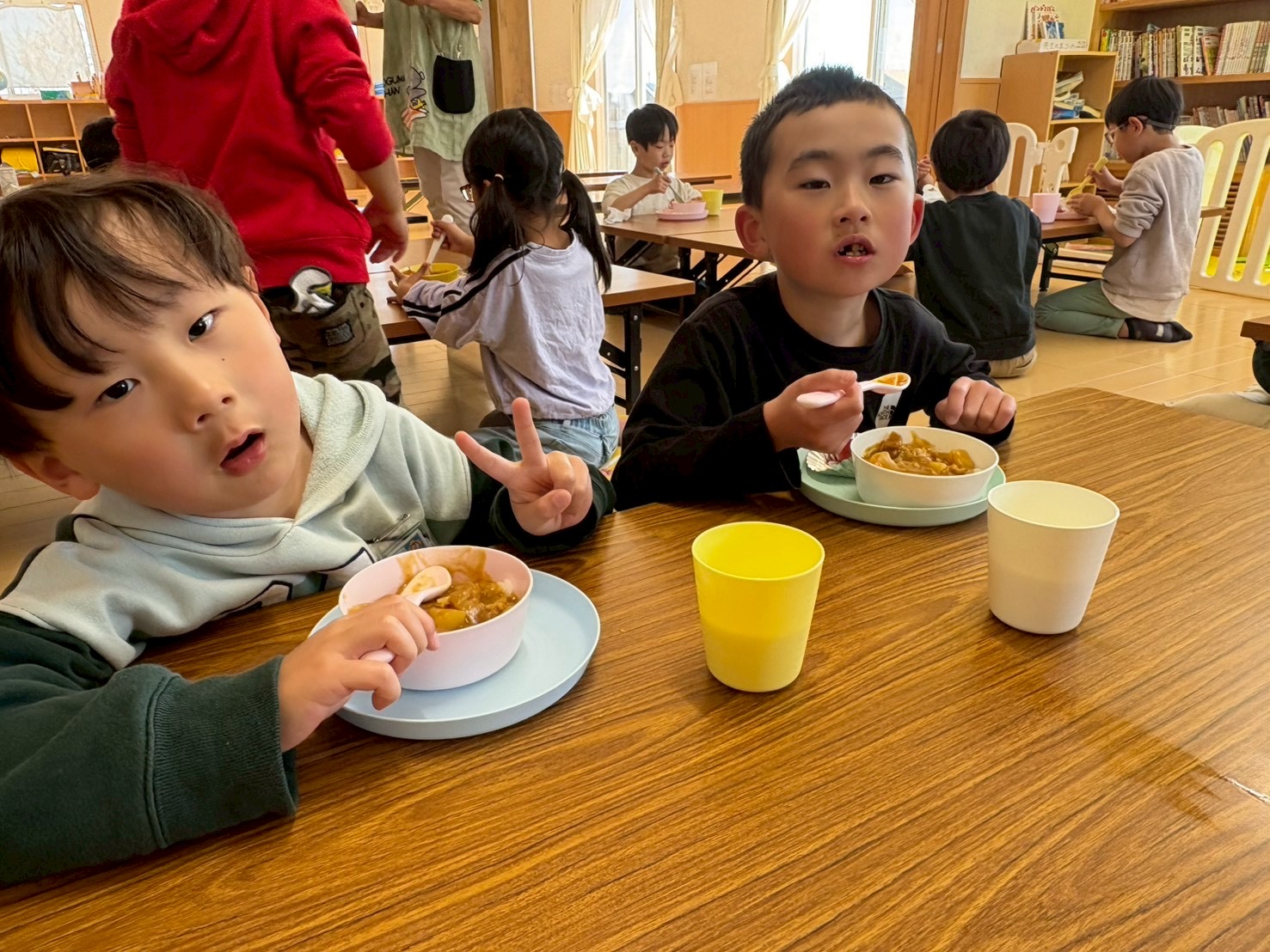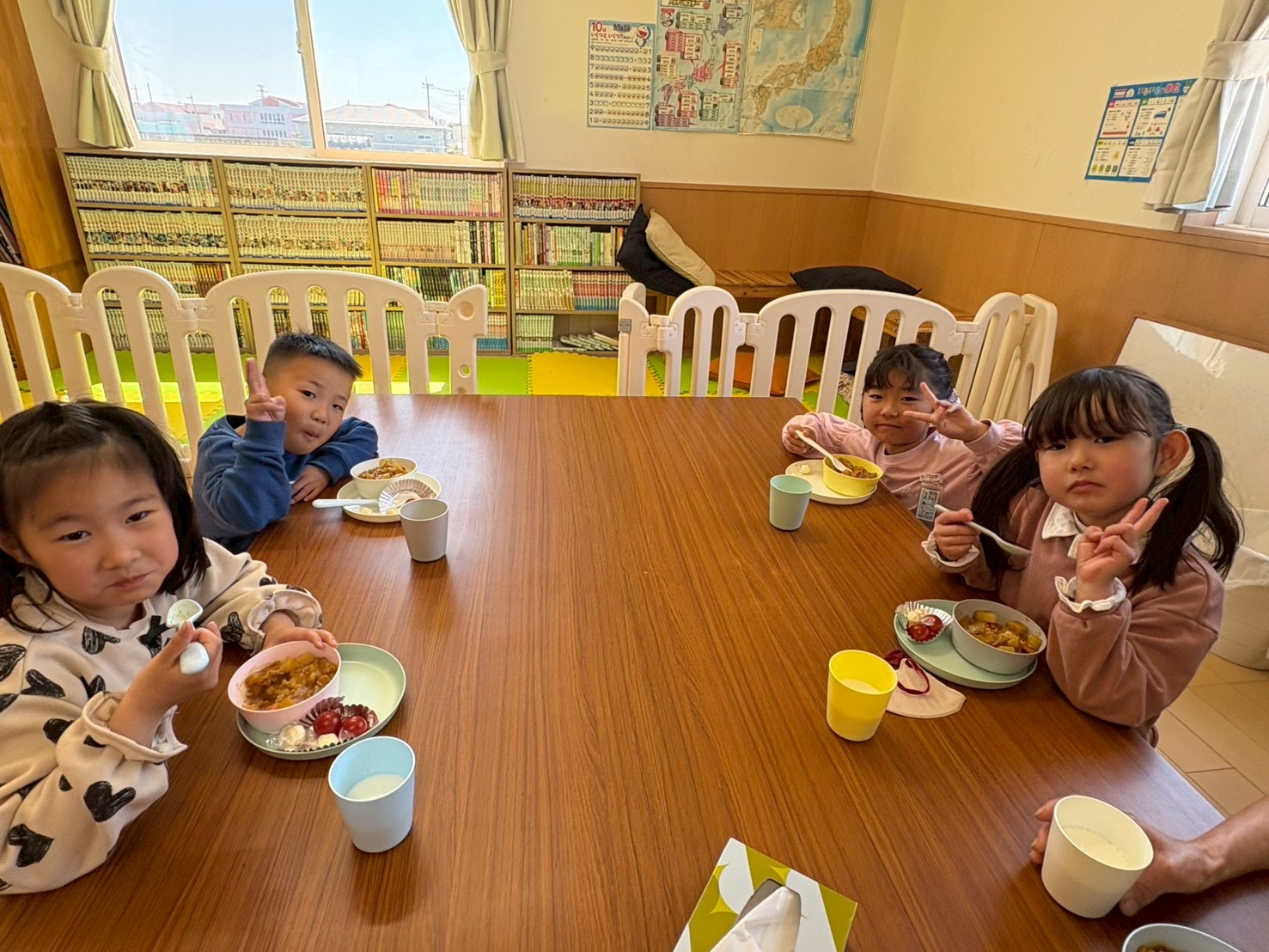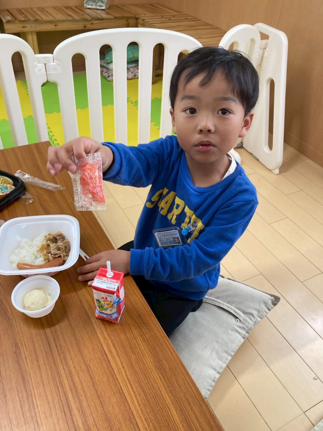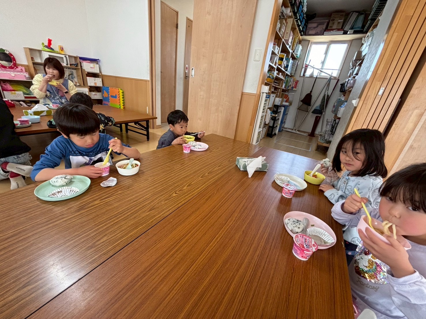 今週は給食なしでの下校のため、一年生には学童でお昼ご飯を提供させて頂いています。